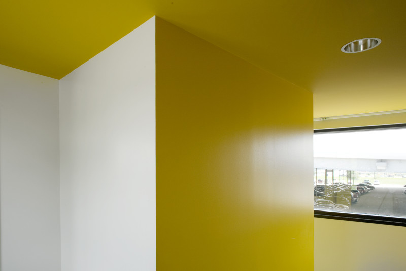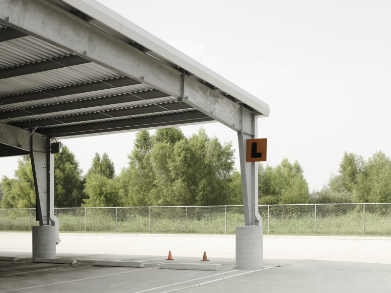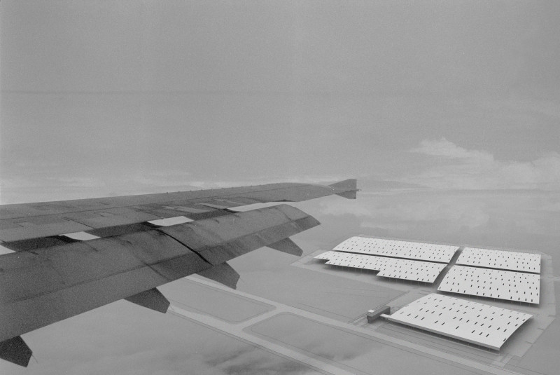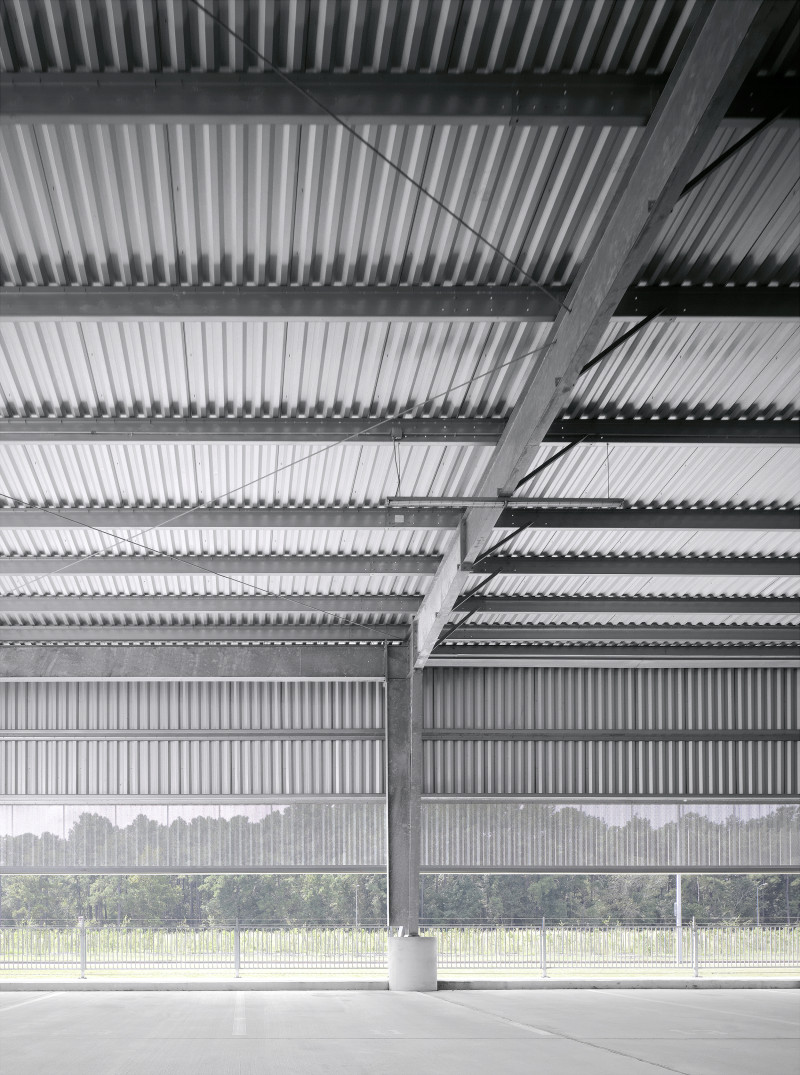 The programmatic requirements of accommodating a high volume of vehicles allow the architecture to operate as a surface within the broader visual and spatial field of the airport corridor. Rather than simply registering as a building mass, the open-air structure becomes a horizontal figure in the landscape—visible both from the ground and from above. What emerges is more like an overscaled waiting hall, evidencing the flow and presence of travel while offering an architectural object with visual porosity along the bustling approach to the terminal.