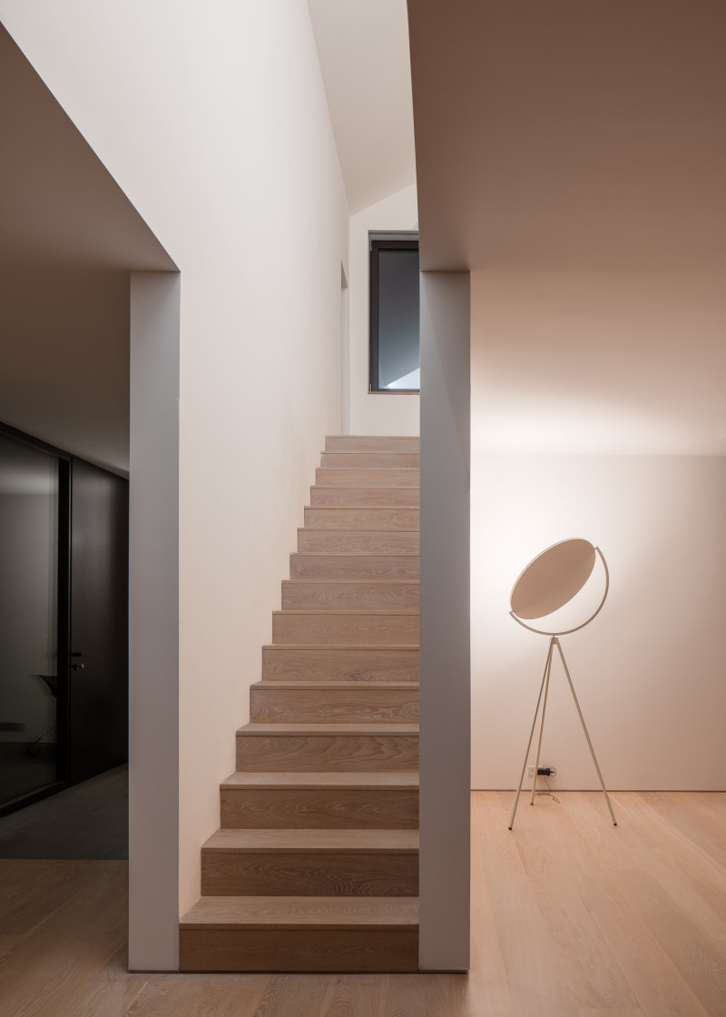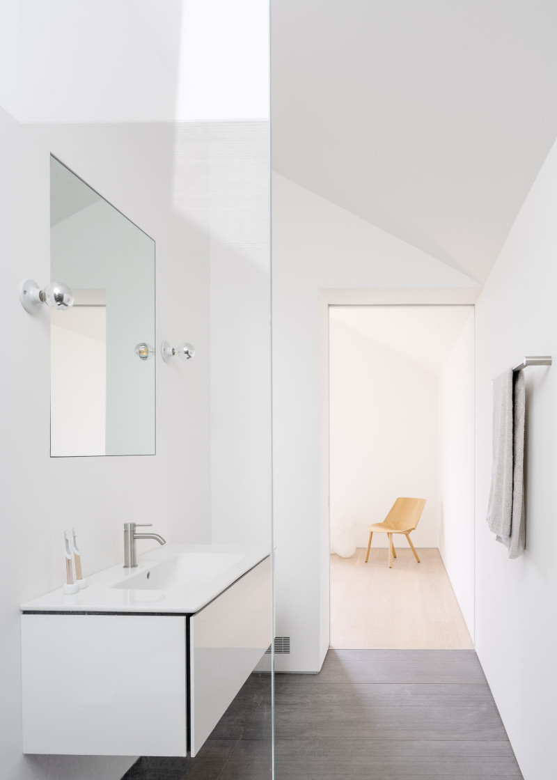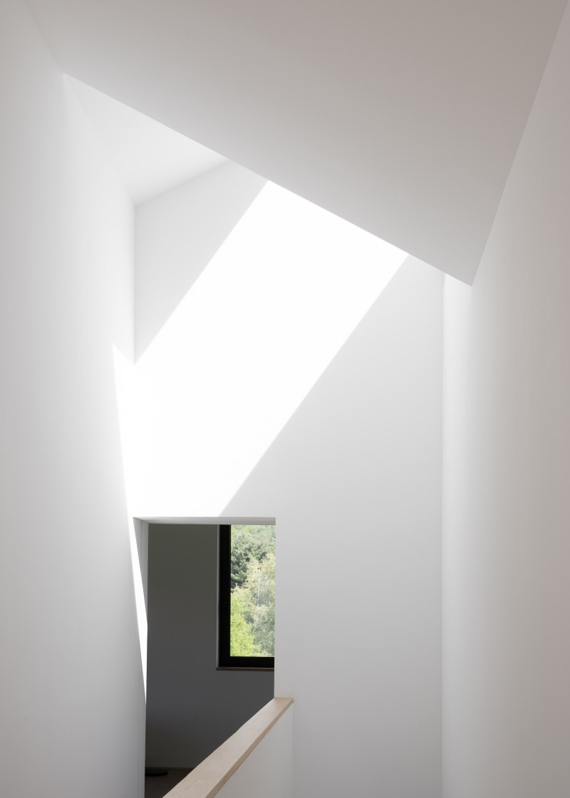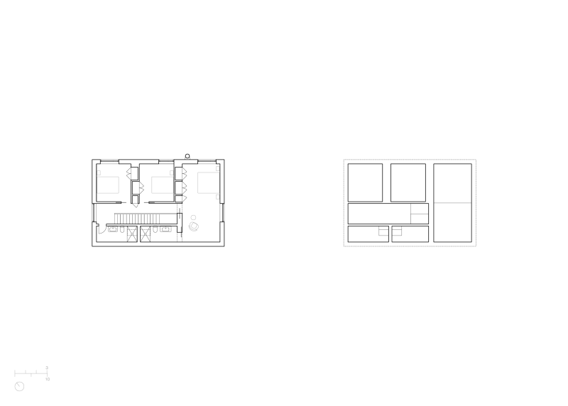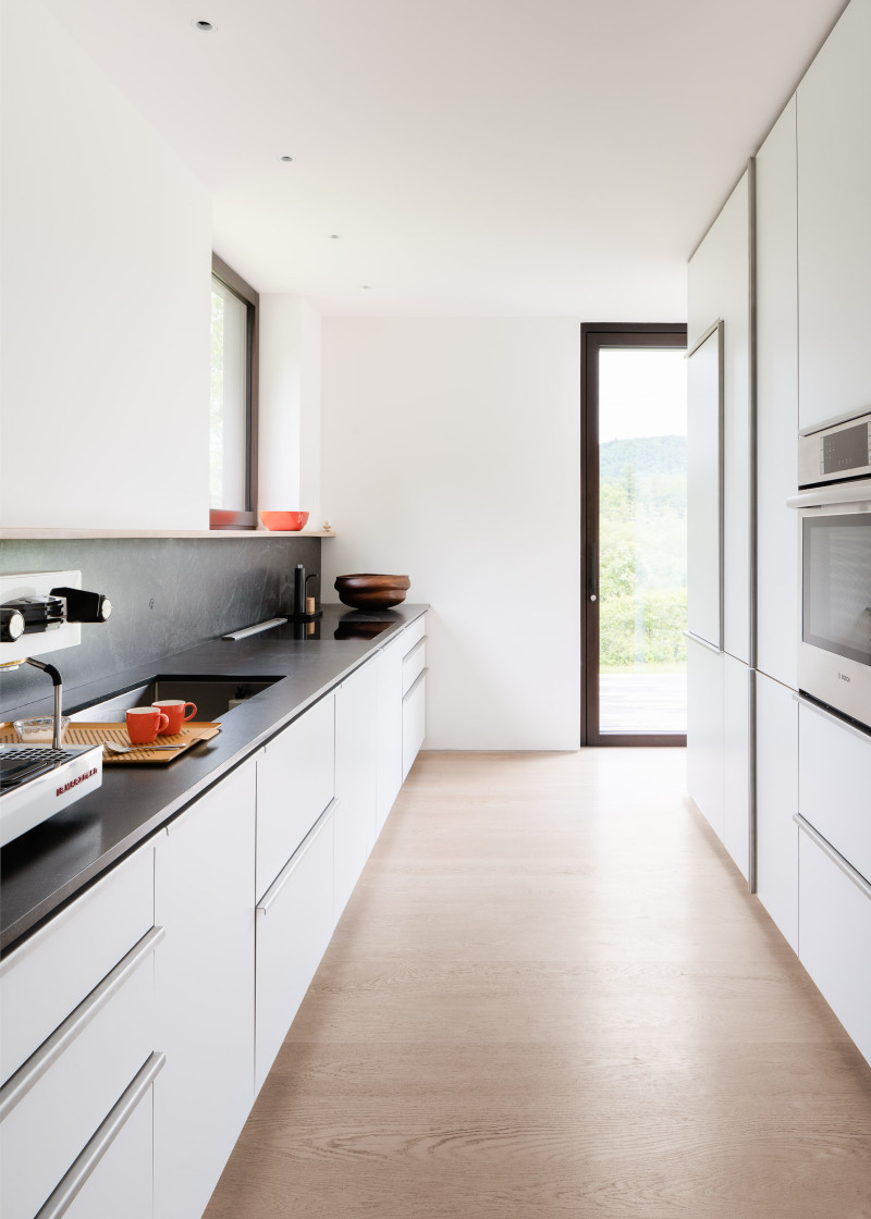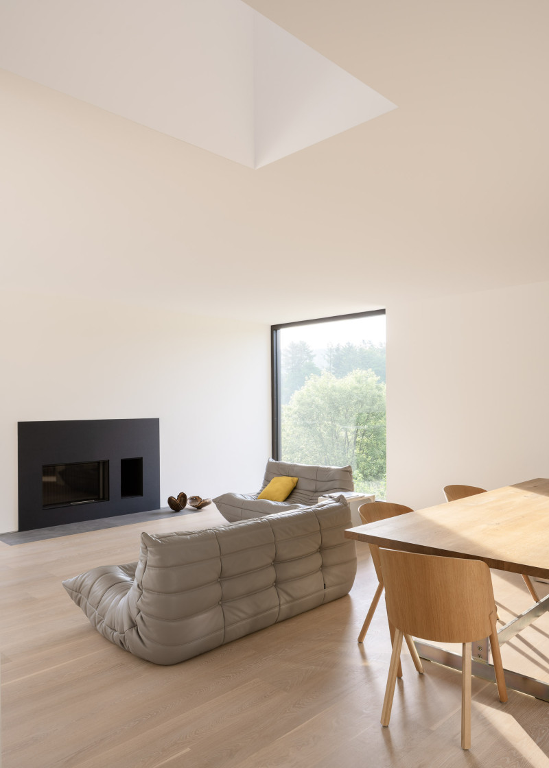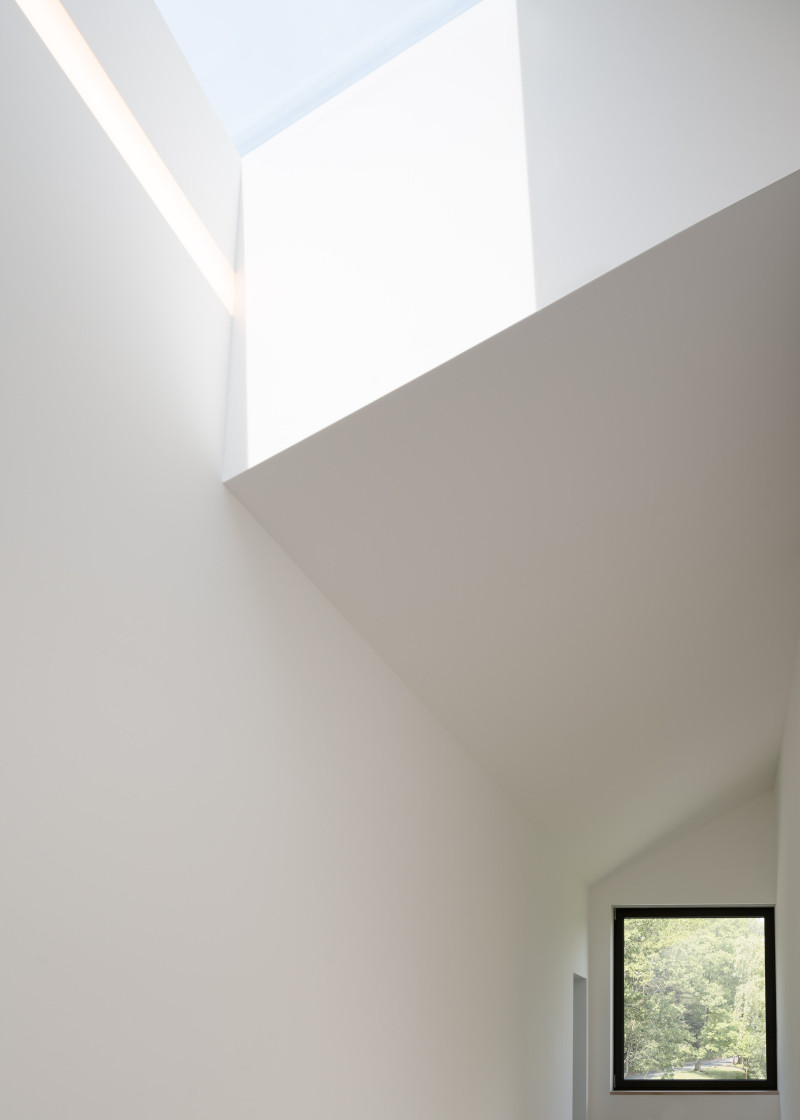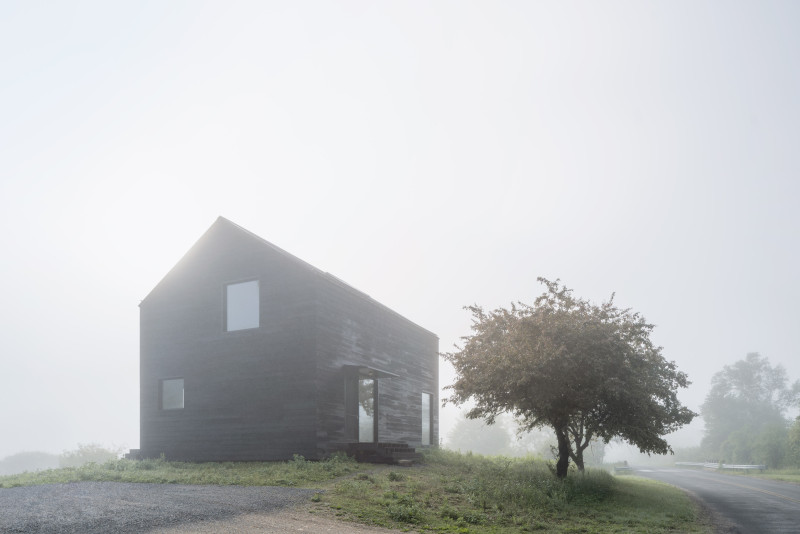 The upper level inverts the open plan into a more compact arrangement, with three bedrooms and two bathrooms organized along a central hall and stair. The house’s formal presence draws from the unadorned vernacular silhouette and proportions often found in rural settings, while its construction and material expression engage a more unified and minimal architectural presence—realized through advanced building envelope performance and contemporary construction methods.