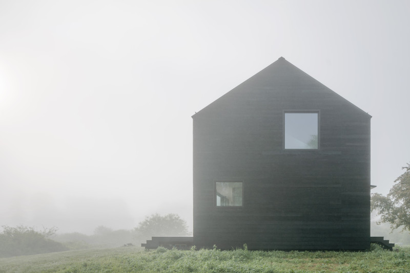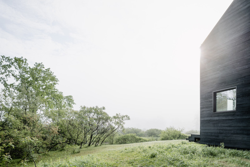 The house presents as a compact black volume in the landscape, with a ventilated facade construction clad in eastern white cedar modified using the traditional Shou Sugi Ban technique—providing both durability and material depth. A custom window and door profile was co-developed with the window manufacturer to meet the design’s aesthetic and thermal performance criteria.