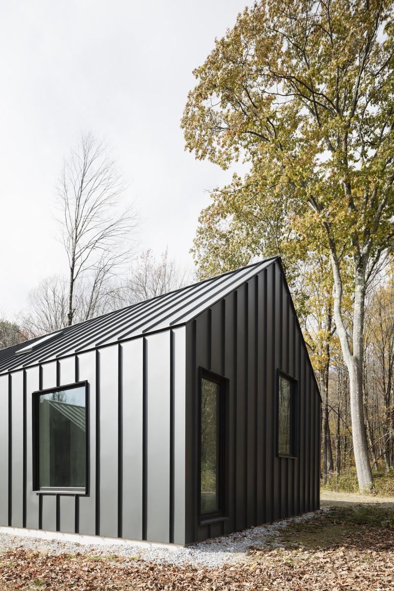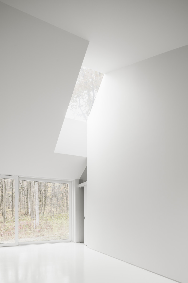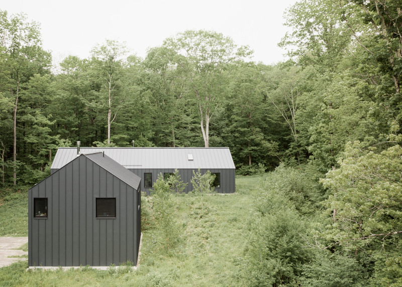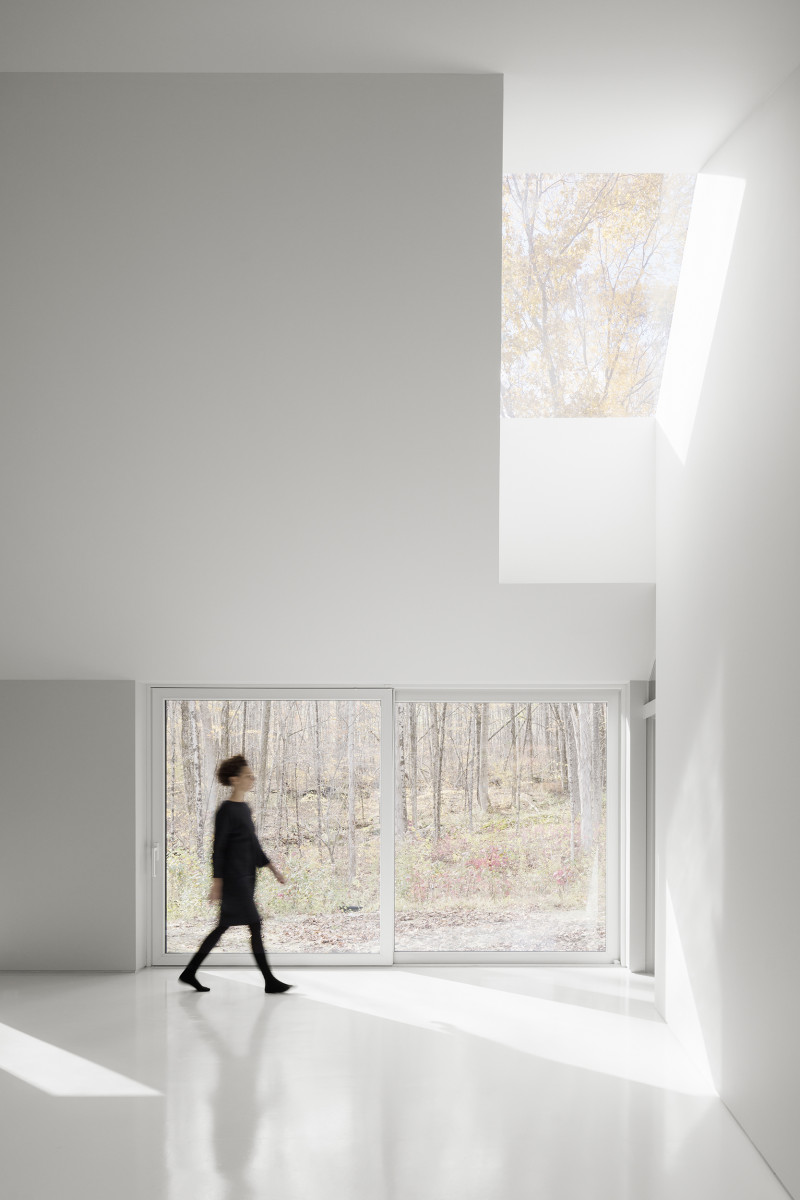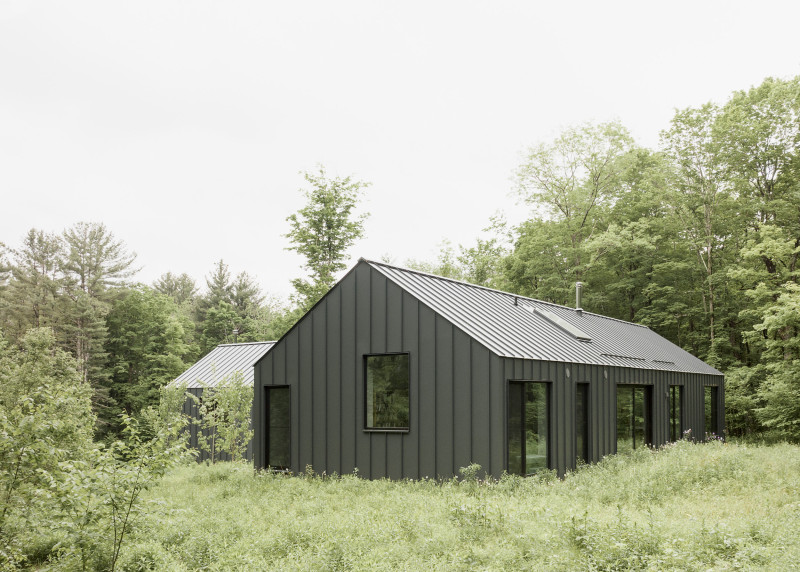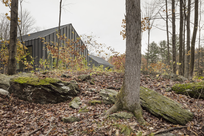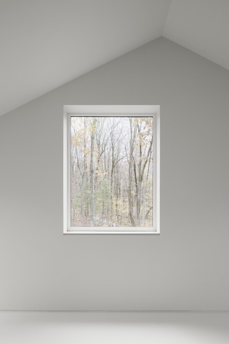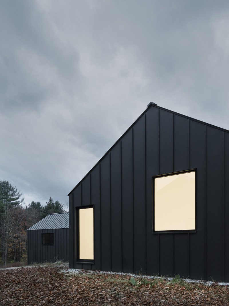 Located on a woodland site in western Massachusetts, House FOUR is a 2,400 sq.ft. [223 sq.m.] single-level residence accompanied by a detached two-story studio and garage building. Designed in response to the site’s topography and natural surroundings, the house is organized as a series of flowing domestic spaces anchored by two central functional volumes. These volumes present themselves as compact architectural objects within the larger spatial field of the house and work in tandem with two skylights to introduce the dynamic of natural light—one in the kitchen and the other in the main living area—creating sculptural focal points in the interior experience.