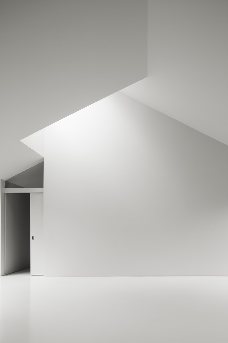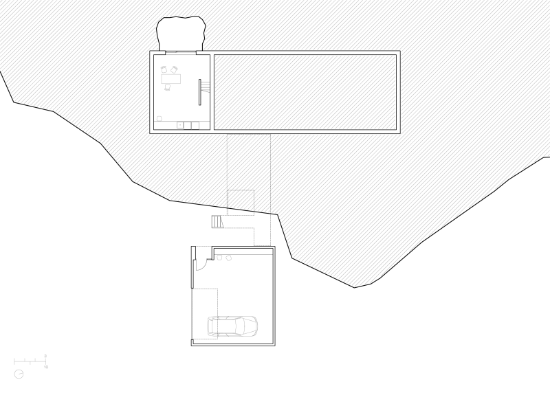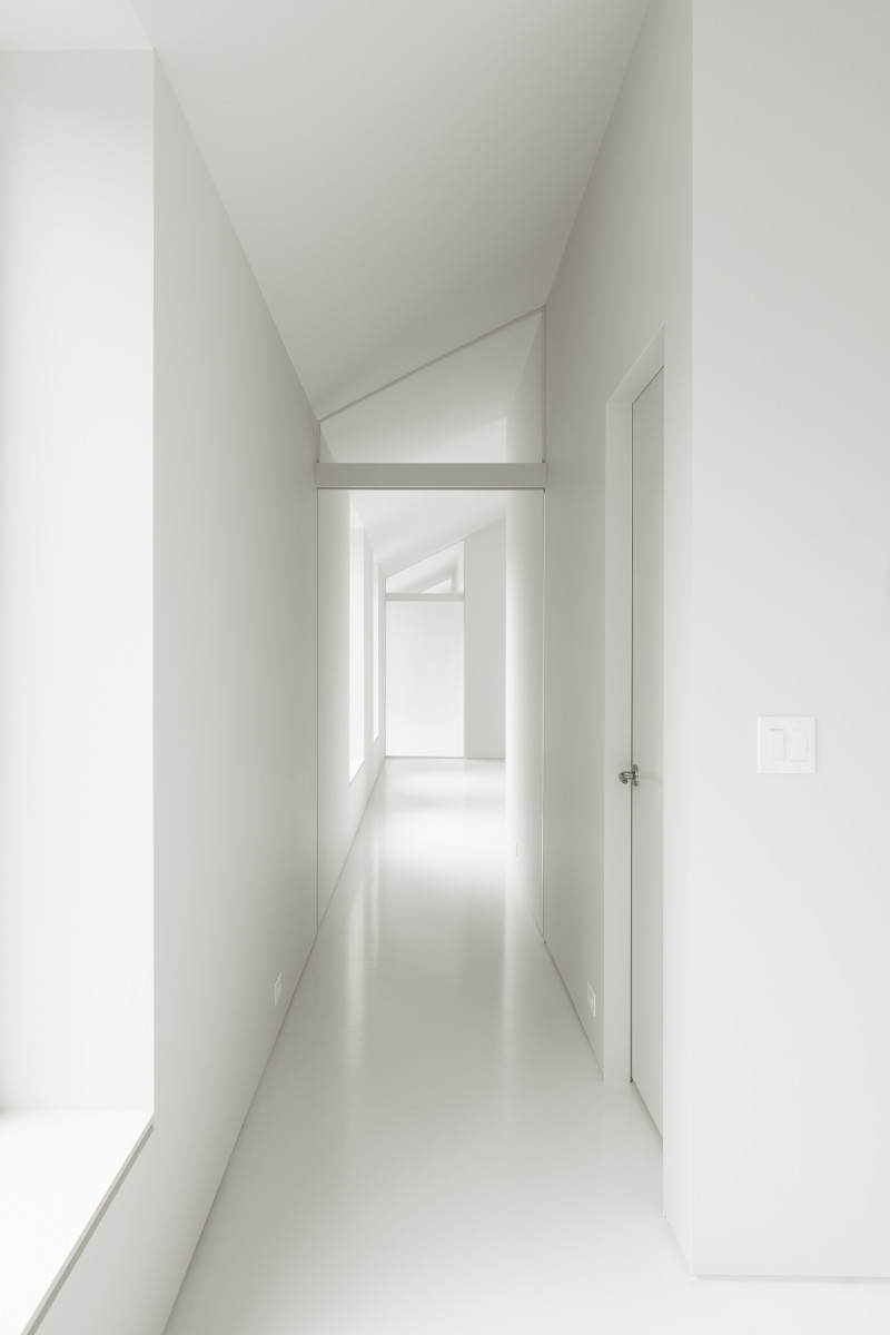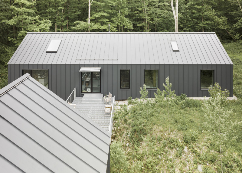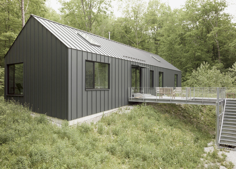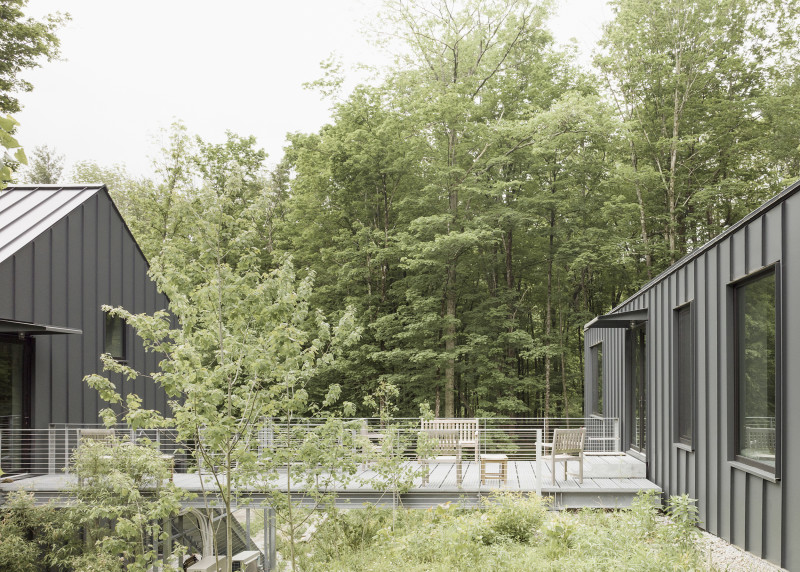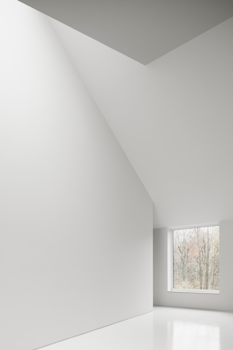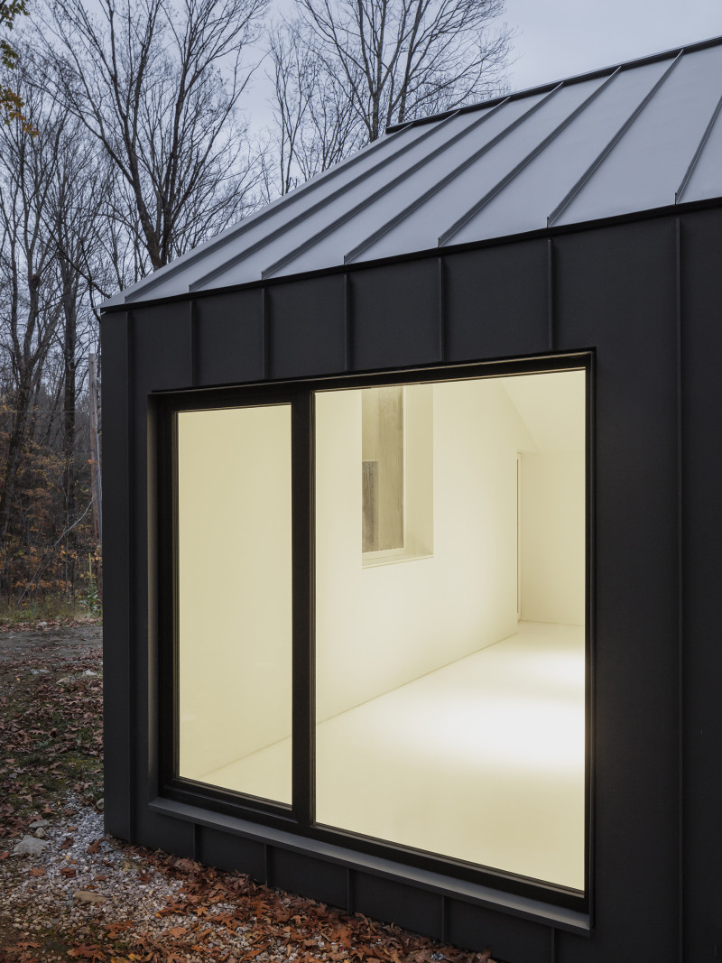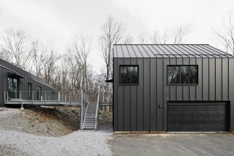 Located on a woodland site in western Massachusetts, House FOUR is a 2,400 sq.ft. [223 sq.m.] single-level residence accompanied by a detached two-story studio and garage building. Designed in response to the site’s topography and natural surroundings, the house is organized as a series of flowing domestic spaces anchored by two central functional volumes. These volumes present themselves as compact architectural objects within the larger spatial field of the house and work in tandem with two skylights to introduce the dynamic of natural light—one in the kitchen and the other in the main living area—creating sculptural focal points in the interior experience.