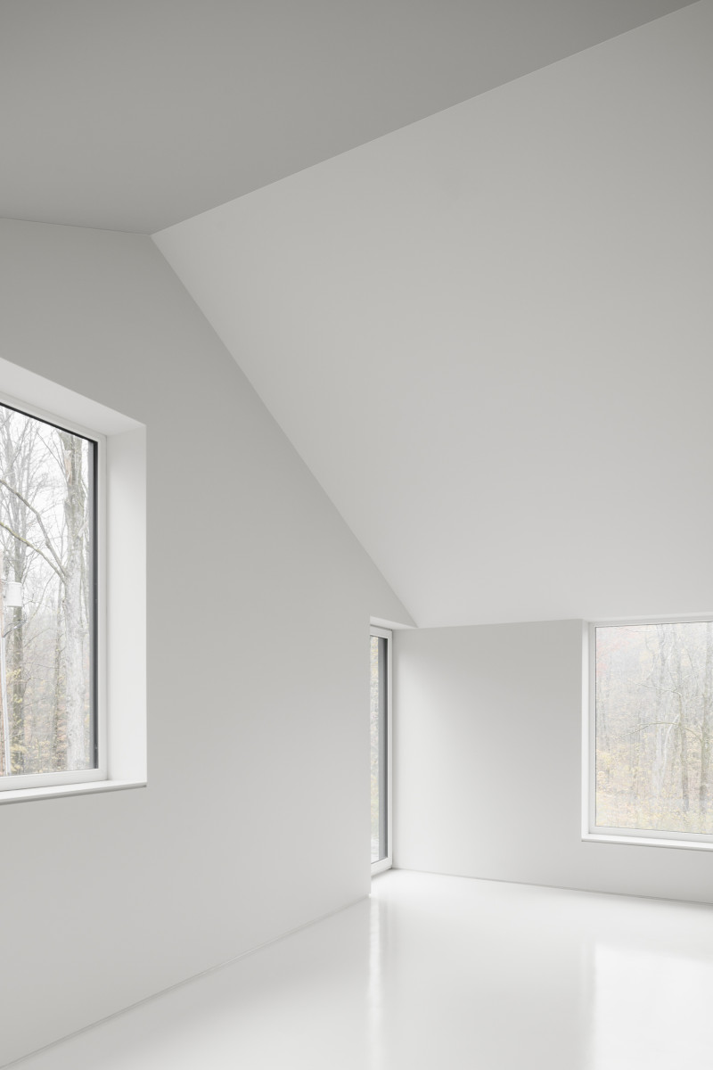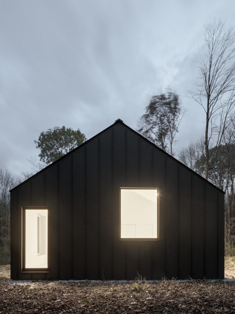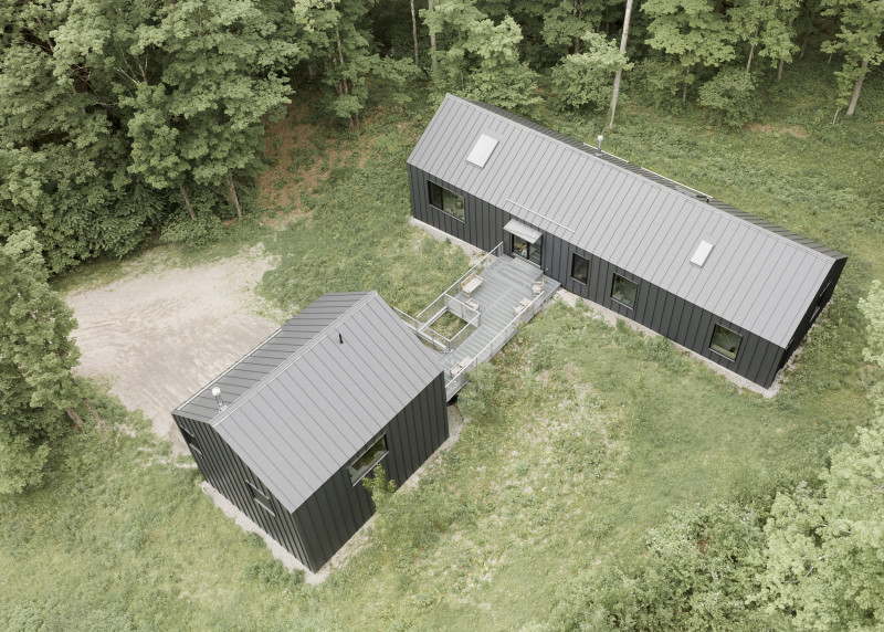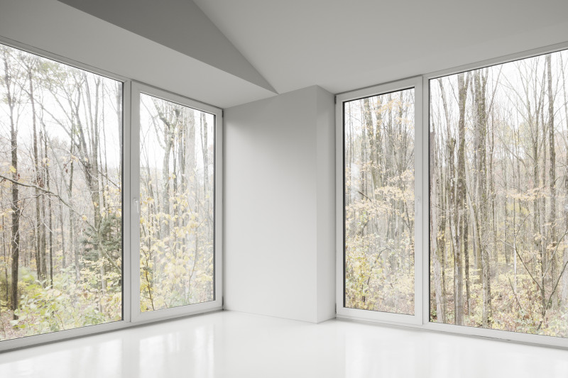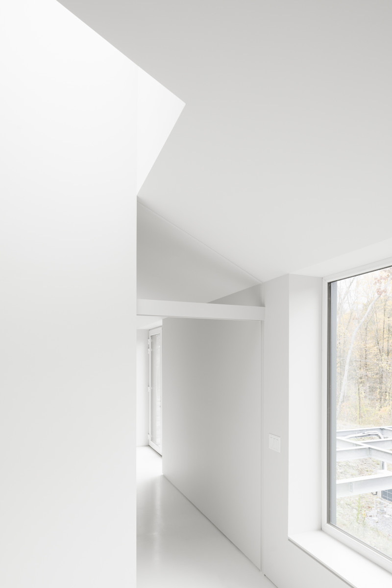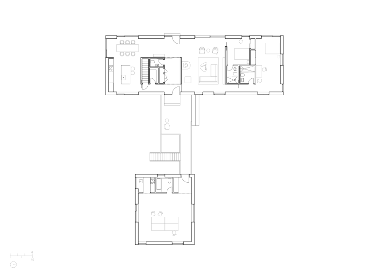 The approach to detailing is deliberately reduced, with a sequence of sliding doors enabling rooms to open into one another. This allows for spatial continuity and visual expansion while preserving moments of separation as desired. These strategies support a spatial condition of eased openness, framing extended views to the surrounding meadow and forest beyond.