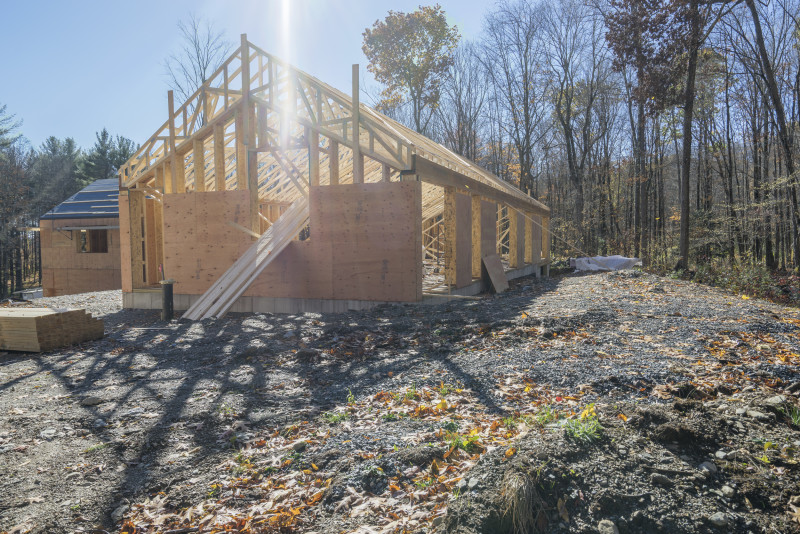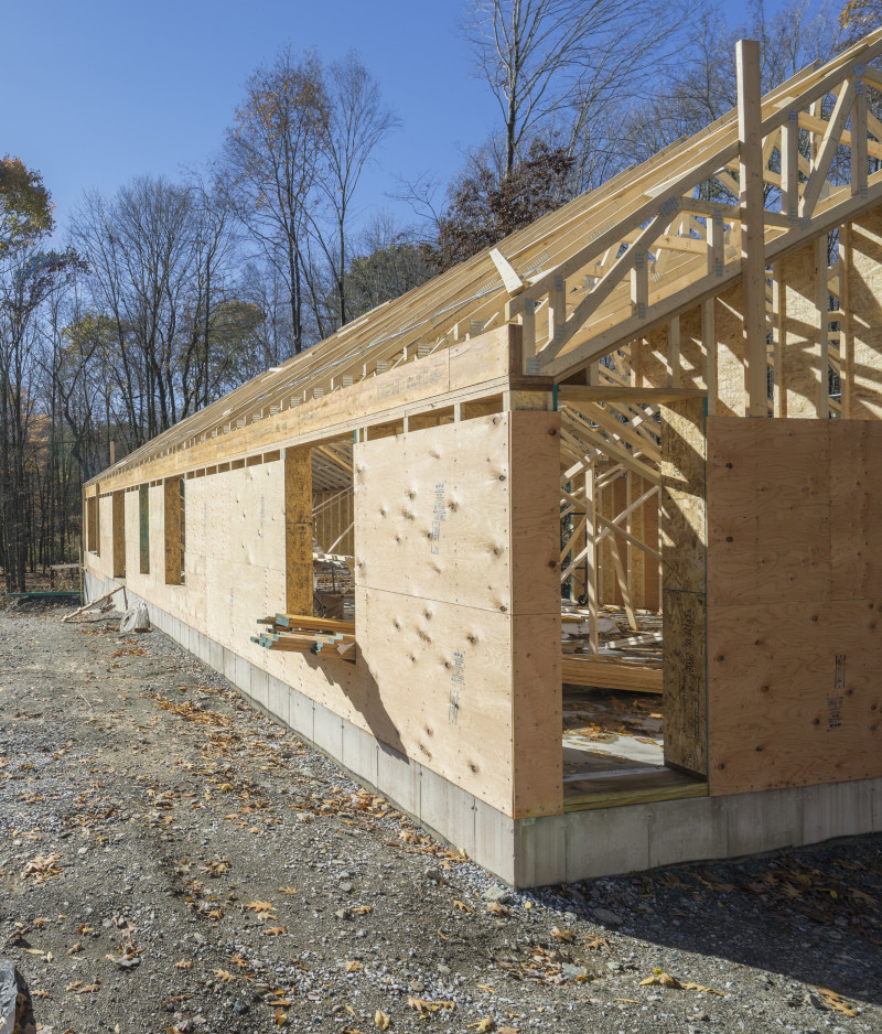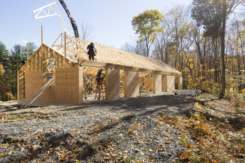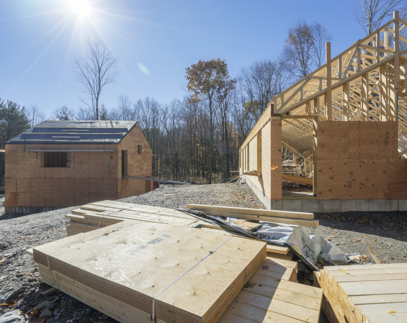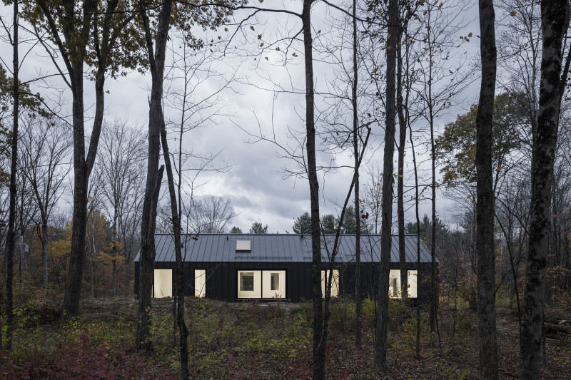 The construction system integrates prefabricated components with a high-performance building envelope based on passive house principles. Walls achieve an R-value of 45, with roof insulation reaching R60. The building assembly includes continuous air and moisture control strategies and non-toxic finishes throughout. Triple-pane insulated glazing maximizes envelope efficiency and visual connection to the outdoors. An efficient all-electric energy system, centered on an air-source heat pump, supports year-round comfort and low operational energy demand, allowing the house to meet net-zero-ready performance standards.