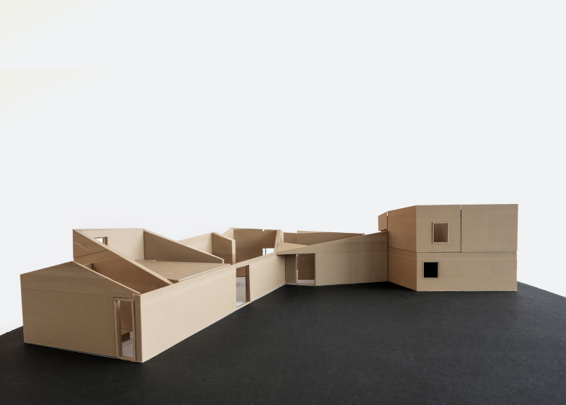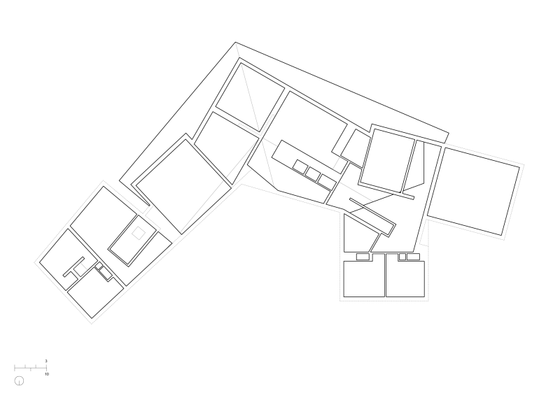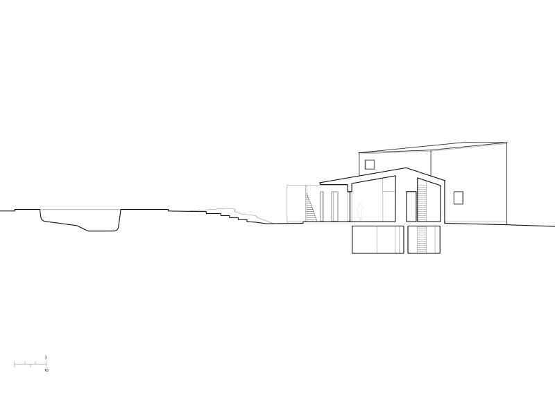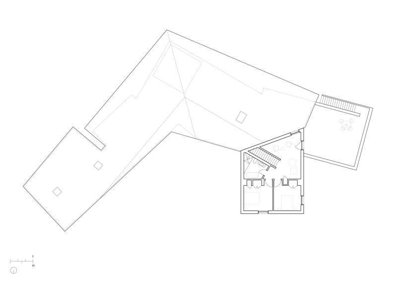 In response to the tension between local autonomy as expressed in the plan and an overall architectural unity, the roof develops as a single, continuous pitched volume that extends over the entire main level. Deep overhangs to the southeast and southwest establish a unifying edge for the main cluster of rooms, providing both solar shading and a coherent outer boundary. This allows for expansive glazing to the most exposed elevations, opening the house fully to the surrounding field and meadow beyond.