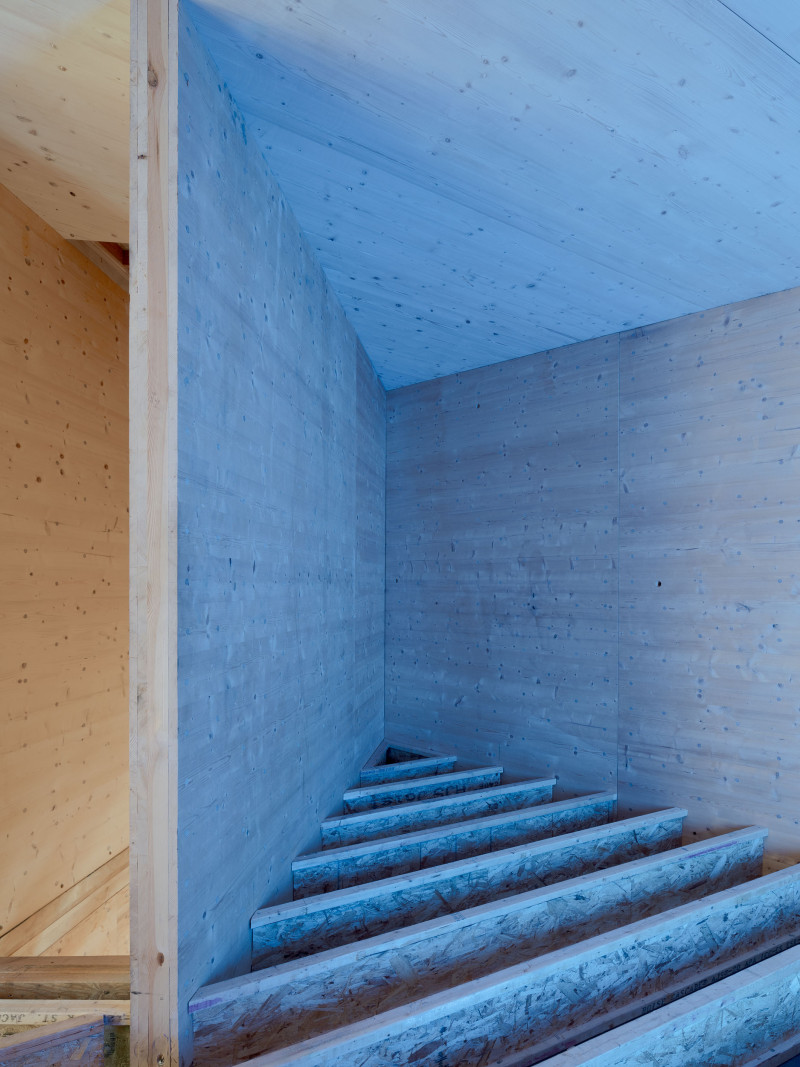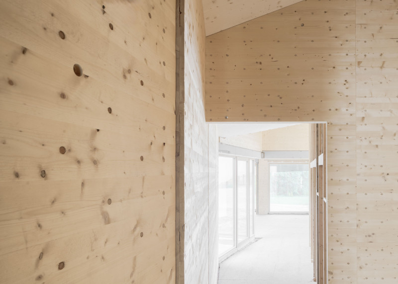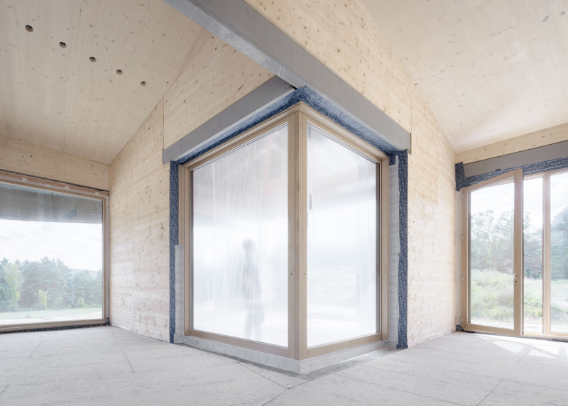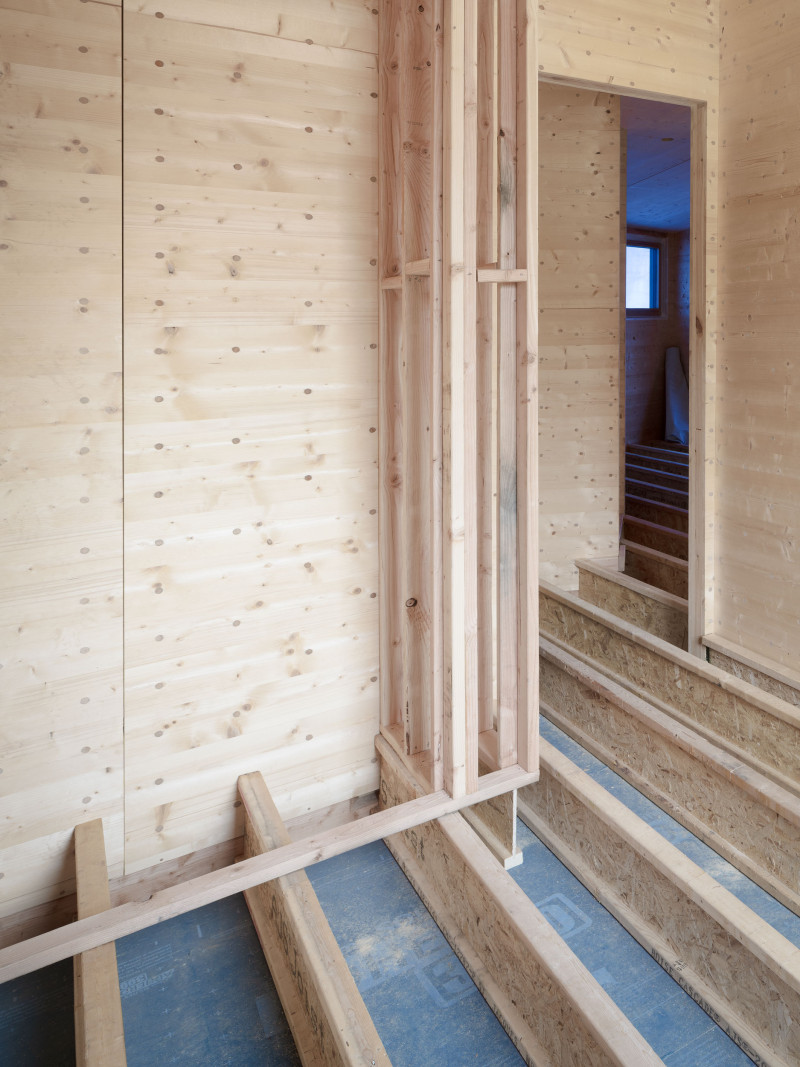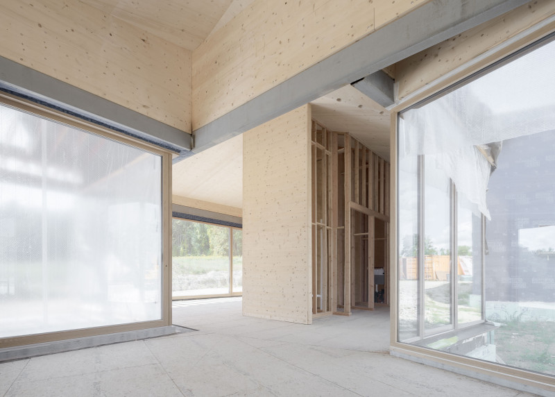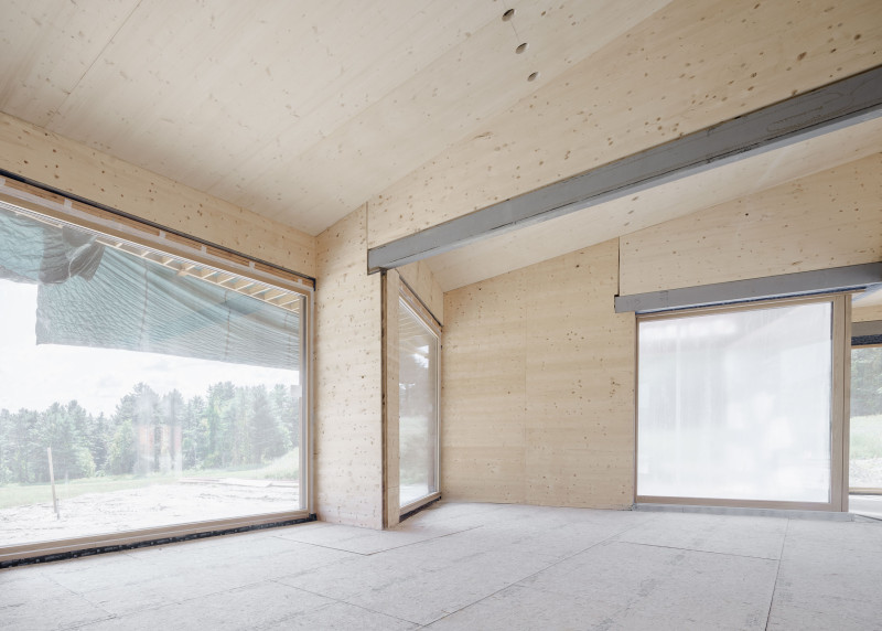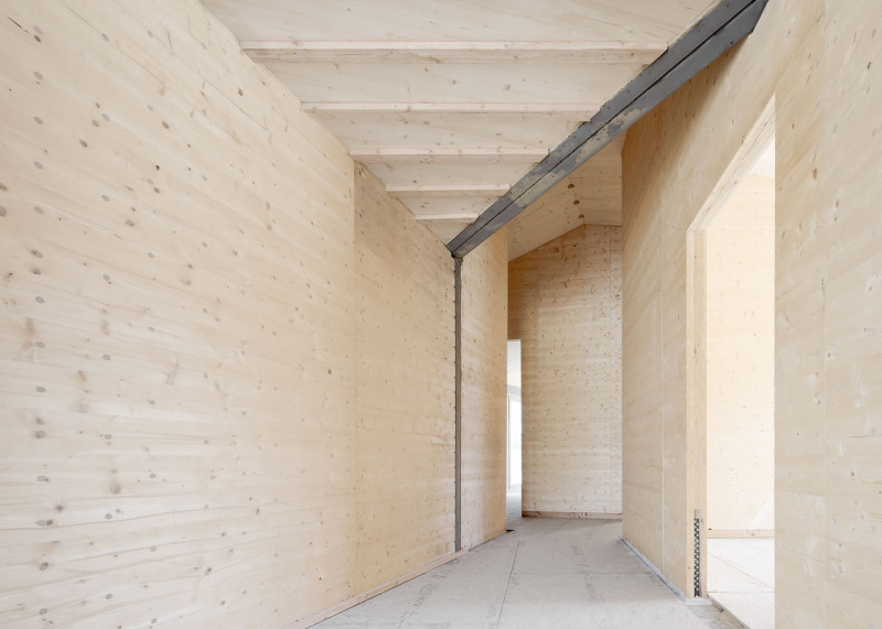 The building is constructed using a prefabricated, panelized mass timber system based on dowel-laminated timber (DLT), a glue-free method that supports a healthy indoor environment. Paired with wood-based continuous insulation, high-performance triple-pane glazing with integrated exterior shading, and non-toxic finishes, the design is developed as a hygroscopic assembly that contributes meaningfully to indoor air quality and human comfort.
