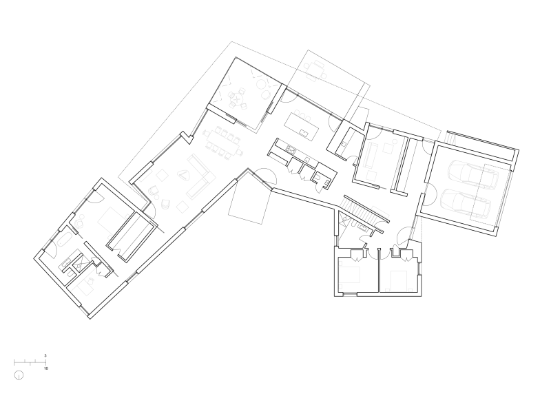 This logic carries into the private zones, where bedrooms and secondary living spaces remain loosely connected to the main spatial flow while supporting autonomy. The primary suite, for instance, is linked to the living areas via an open hallway with concealed sliding doors that allow for separation as desired. The plan follows a somewhat informal geometric order, allowing each room to orient itself locally, producing an organizational rhythm that negotiates between the intimacy of the room and the collective scale of the house.