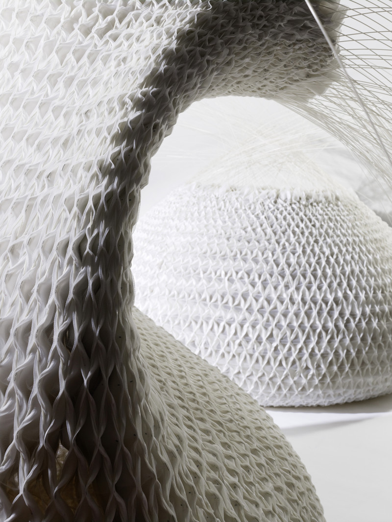 Central to the emerging research was the question of how one could move the material performances into new applications of architectural space, thus expanding the potential range from window covering to architectural partitions of space with embedded light and temperature control qualities. The research included developing a structural weave that integrates into the light weight fabric in order to achieve free-standing material configurations.